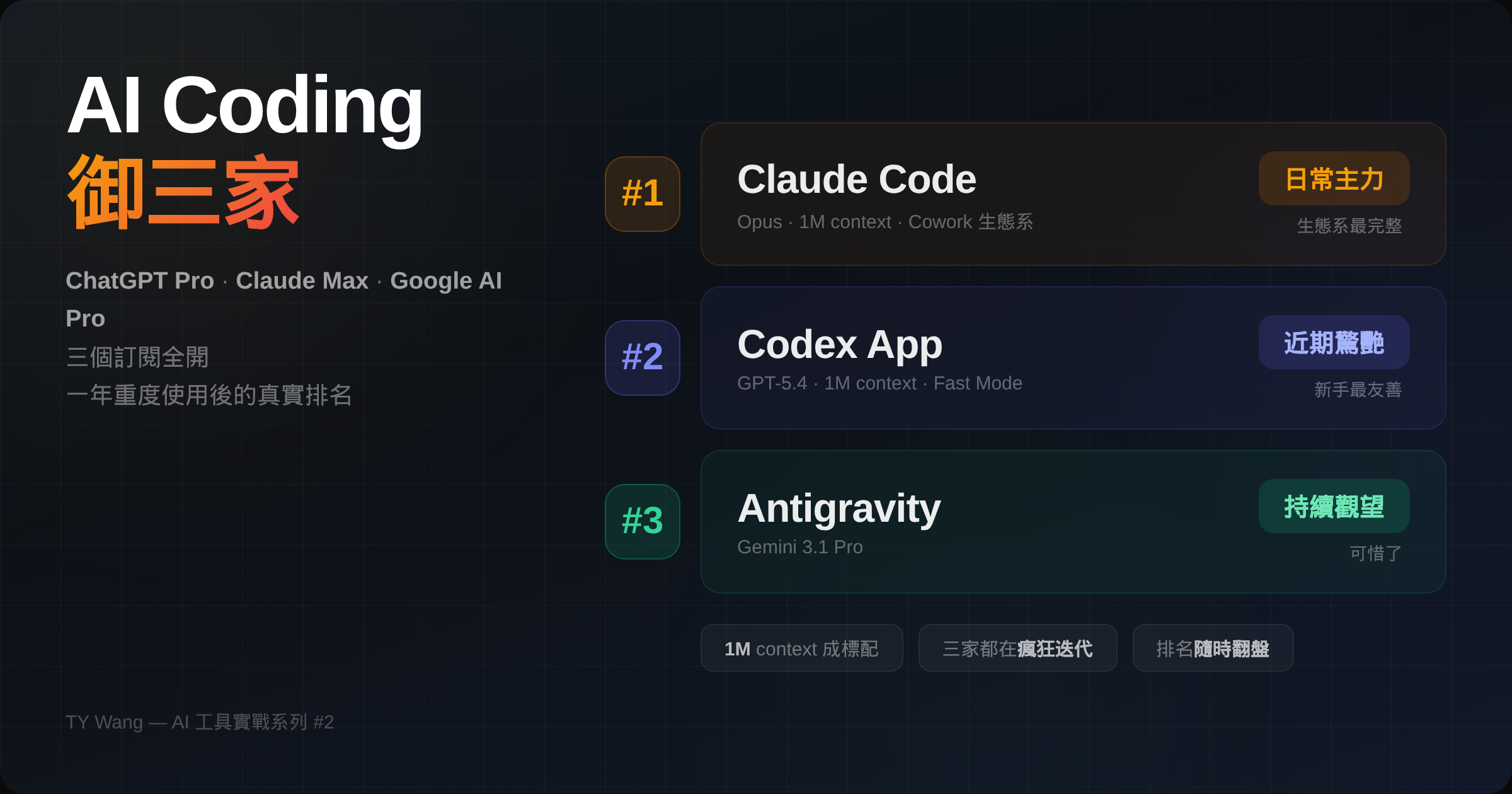 從去年開始,我同時訂閱了 ChatGPT Pro、Claude Code Max、Google AI Pro,基本上把三大 AI coding 工具都開滿在用。一年多下來,累積了不少使用經驗,也踩了不少坑。