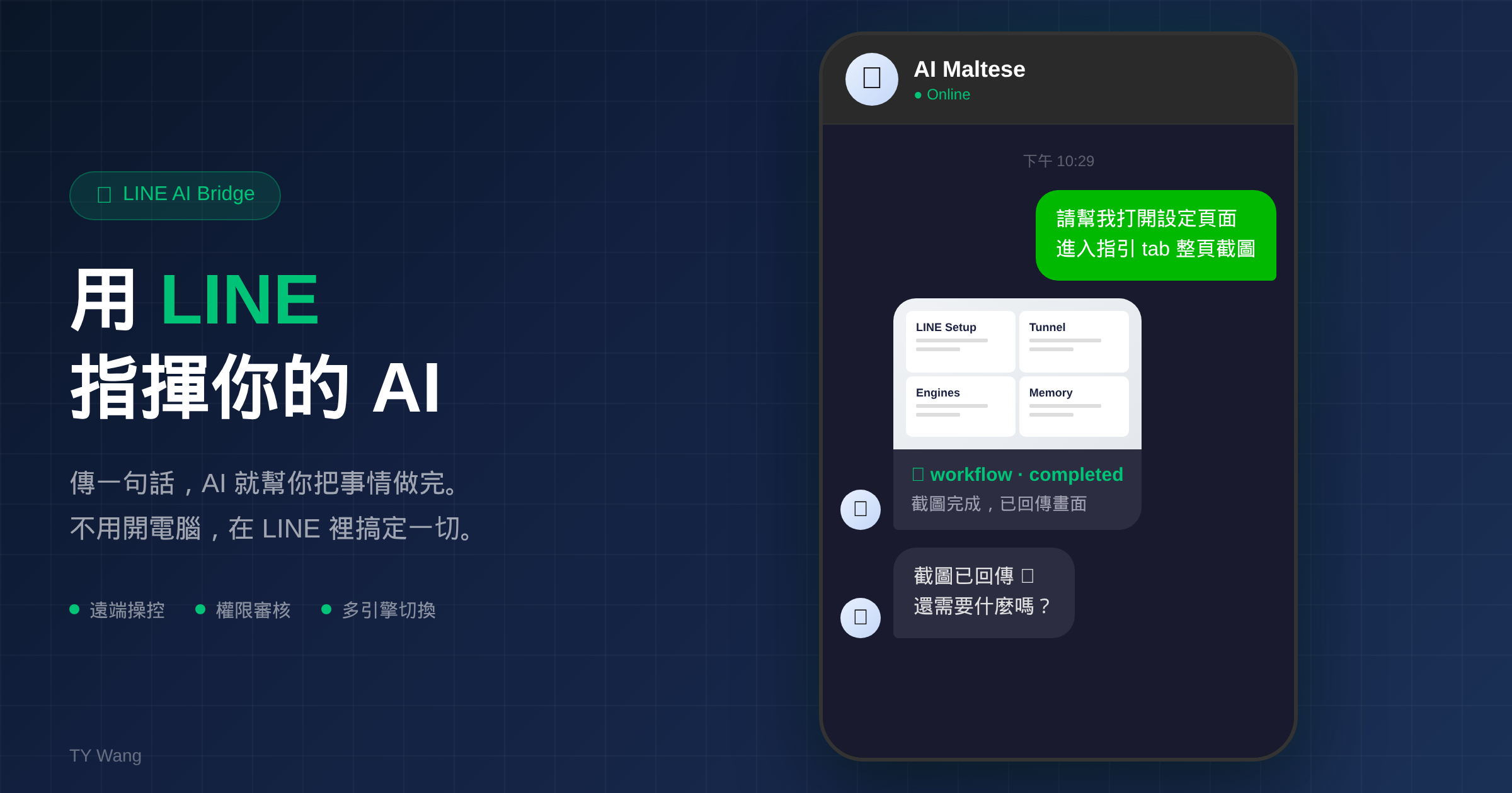 你人在外面,用 LINE 傳一句「幫我打開某個頁面,截圖給我看一下」,你電腦上的 AI 就自動去做,做完再把結果傳回 LINE 給你。
